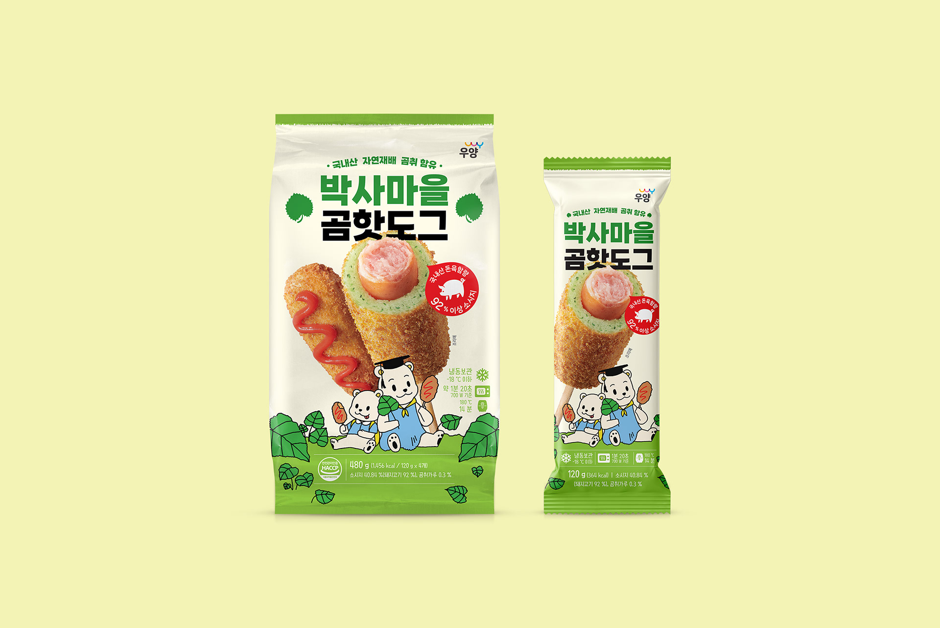 곰취가 함유된 박사마을에서 판매중인 곰핫도그 제품입니다.