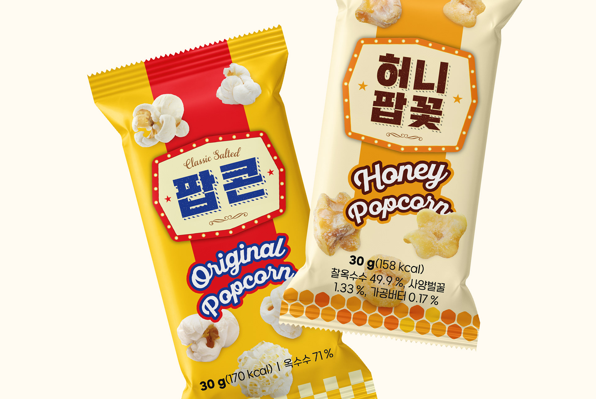 허니 팝콘 패키지 하단에는 벌집 패턴을 적용해 꿀의 달콤함과 원재료 이미지를 직관적으로 전달했습니다.